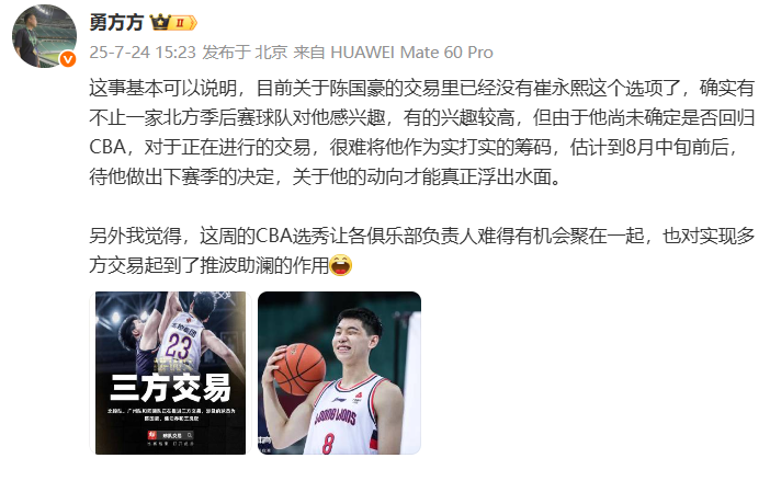 永利欢乐娱人城官网而媒体人勇方方7月24日则说:“确实有不止一家北方季后赛球队对他(崔永熙)感兴趣,有的兴趣较高,但由于他尚未确定是否回归CBA,对于正在进行的交易,很难将他作为实打实的筹码,估计到8月中旬前后,待他做出下赛季的决定,关于他的动向才能真正浮出水面。”