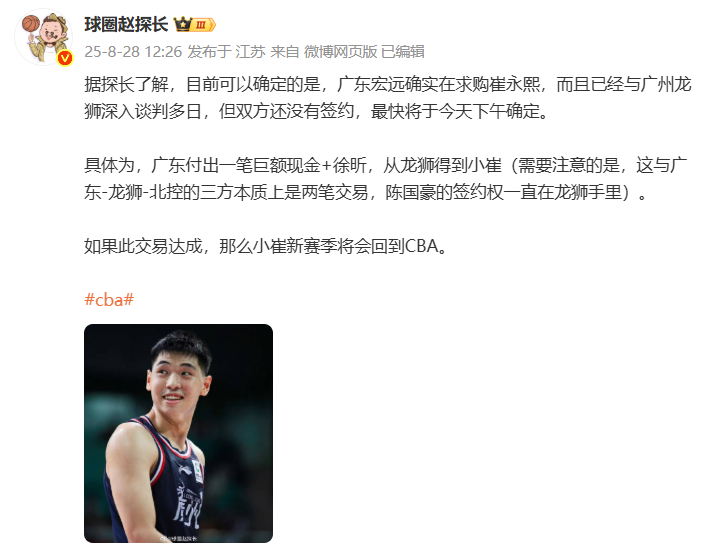 媒体人赵探长则在今天表示:“如果此(广东男篮和广州男篮)交易达成,那么小崔新赛季将会回到CBA。”