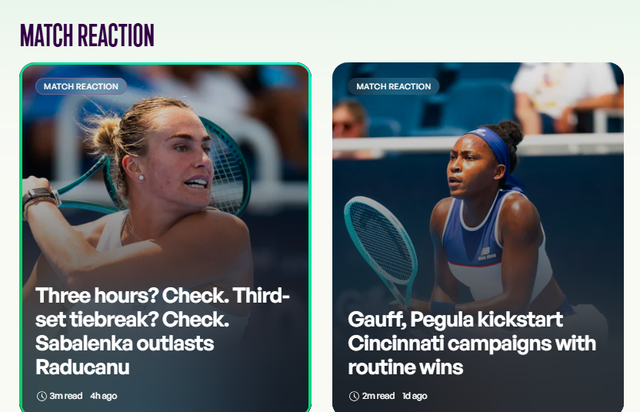 “我很高兴能打赢这场艰难的比赛。”这项男女共站的千分大赛正在美国俄亥俄州进行,也是本赛网坛最后一项大满贯美国公开赛前最后热身,萨巴伦卡耗费3小时又9分钟,戏剧性赢得职业生涯第4漫长鏖战,也完成近18个月内对战22岁英国好手的3连胜,这位赛会头号种子说:“我打了一场冒险的比赛,尝试一些疯狂击球,甚至冲到网前,想办法给她施加压力。希望明天能好好休息,我需要时间从这场艰苦战斗中恢复过来。”WTA官网赛后称,萨巴伦卡现在赢得了职业生涯对阵拉杜卡努的所有三场比赛,都是在过去的18个月里。此外,萨巴伦卡现在赢得了49场比赛,在场上的时间(接近100小时)比任何其他参加 WTA巡回赛的球员都多。