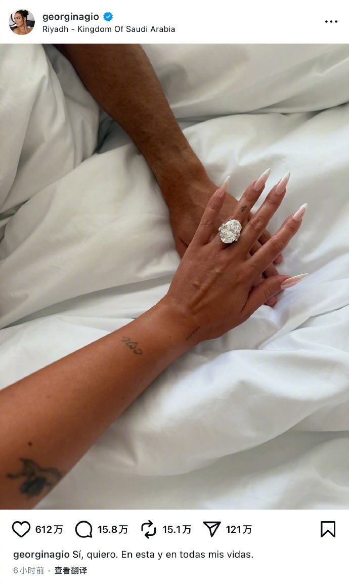 8月12日凌晨,乔治娜在instgram上晒出了与C罗的甜蜜牵手照,而她的左手佩戴上了一枚巨型钻戒,表示自己同意了C罗的求婚。